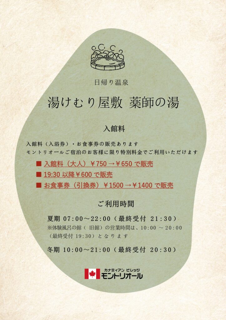お知らせTOPICS 「湯けむり屋敷 薬師の湯」割引変更のお知らせ 2025/08/27 お知らせ スタッフブログ 「湯けむり屋敷 薬師の湯」割引変更のお知らせ 暑い日が続いておりますが、いかがお過ごしでしょうか。 さて、カナディアンビレッジモントリオールでは、ご宿泊のお客様に「湯けむり屋敷 薬師の湯」の特別割引販売しております。 19:30以降のご利用ですとさらにお安くなりました! コテージから温泉施設までは徒歩5分ほどです。橋を渡ってすぐです! ご利用の方はフロントまでお申し付けください。 NEW 「湯けむり屋敷 薬師の湯」割引変更のお知らせ 初心者向け 野鳥観察会 農具川河川公園の芝桜 2025年GWのご予約受付中です 日帰り温泉【湯けむり屋敷 薬師の湯】お得な入館券(入浴券)とお食事券の販売を開始しました CATEGORY お知らせ (55) スタッフブログ (73) その他 (1) ARCHIVE 2025年9月 (2) 2025年8月 (1) 2025年5月 (1) 2025年4月 (1) 2025年3月 (2) 2025年1月 (2) 2024年12月 (1) 2024年9月 (1) 2024年8月 (1) 2024年7月 (3) 2024年6月 (1) 2024年5月 (1) 2024年4月 (1) 2024年3月 (3) 2024年2月 (2) 2024年1月 (1) 2023年12月 (4) 2023年11月 (2) 2023年10月 (3) 2023年9月 (1) 2023年8月 (1) 2023年7月 (3) 2023年6月 (1) 2023年5月 (2) 2023年4月 (3) 2023年3月 (1) 2023年2月 (2) 2023年1月 (6) 2022年12月 (3) 2022年11月 (2) 2022年10月 (6) 2022年9月 (5) 2022年8月 (1) 2022年7月 (3) 2022年6月 (3) 2022年5月 (1) 2022年4月 (1)